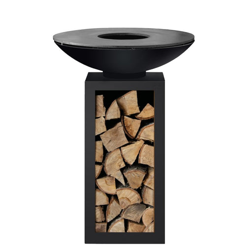 OutrEen Plancha B 100 + Open Sokkel bestaat uit drie delen: een zwarte sokkel voor houtopslag met daarop een zwarte vuurschaal 100 cm, afgewerkt met ee...