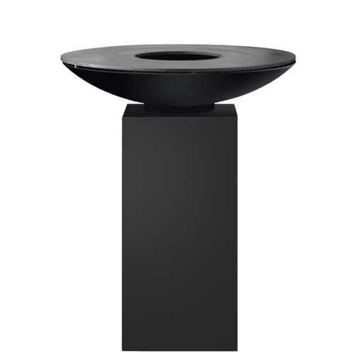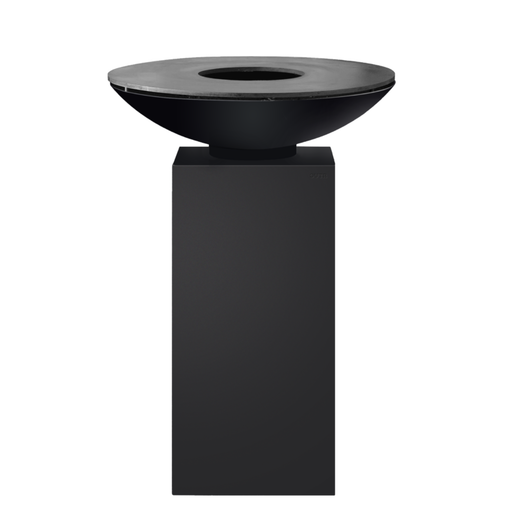 OutrEen Plancha B 80 + Gesloten Sokkel bestaat uit drie delen: een zwarte sokkel met daarop een zwarte vuurschaal 80 cm, afgewerkt met een bakplaat bov...