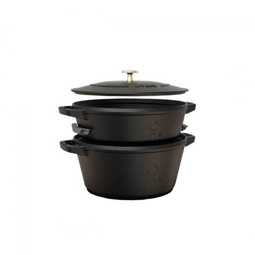 OfyrDe OFYR Cast Iron Casserole Set 21 – 26 bestaat uit twee gietijzeren pannen met deksel, met diameters van respectievelijk 21 cm en 26 cm. Deze pann...
